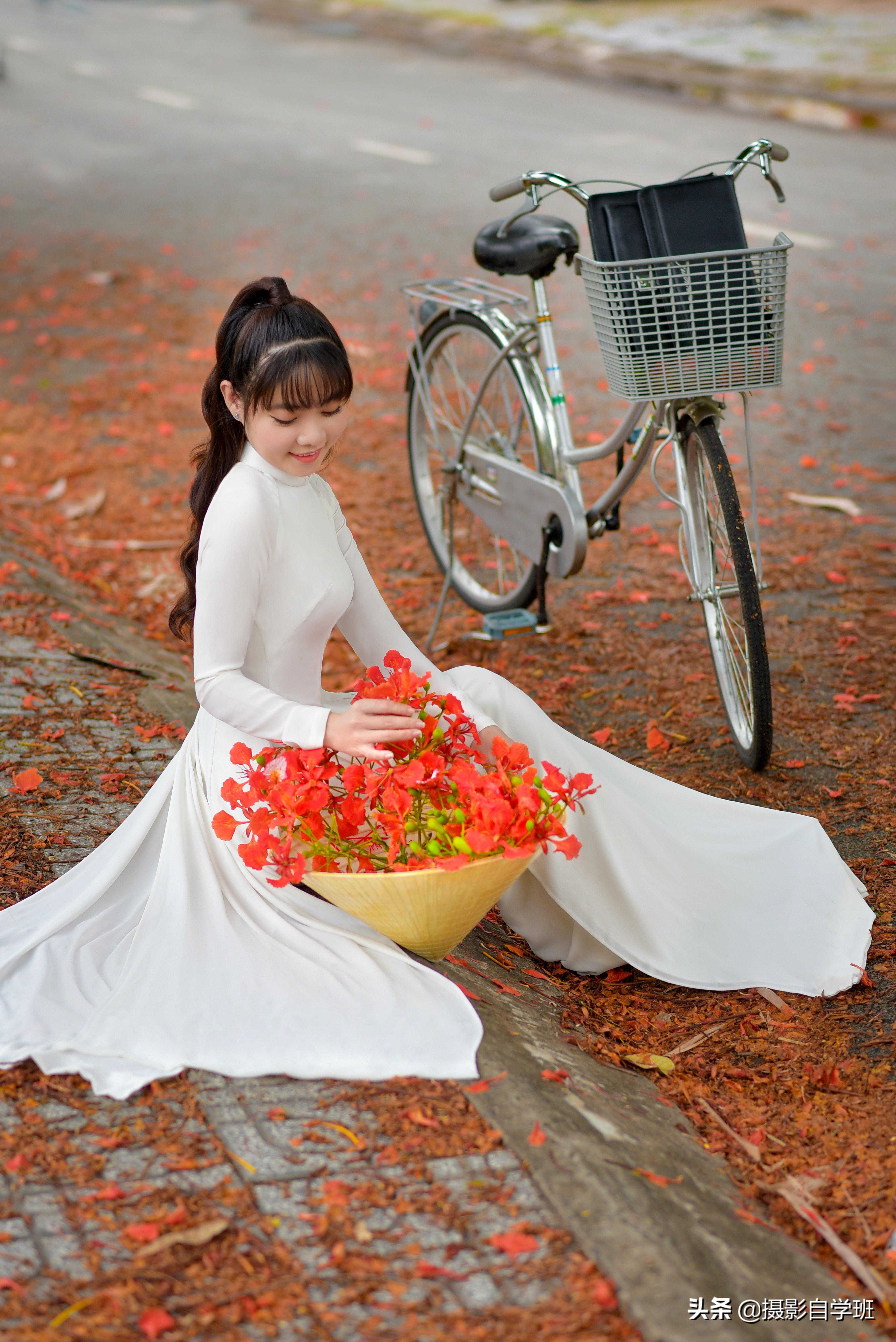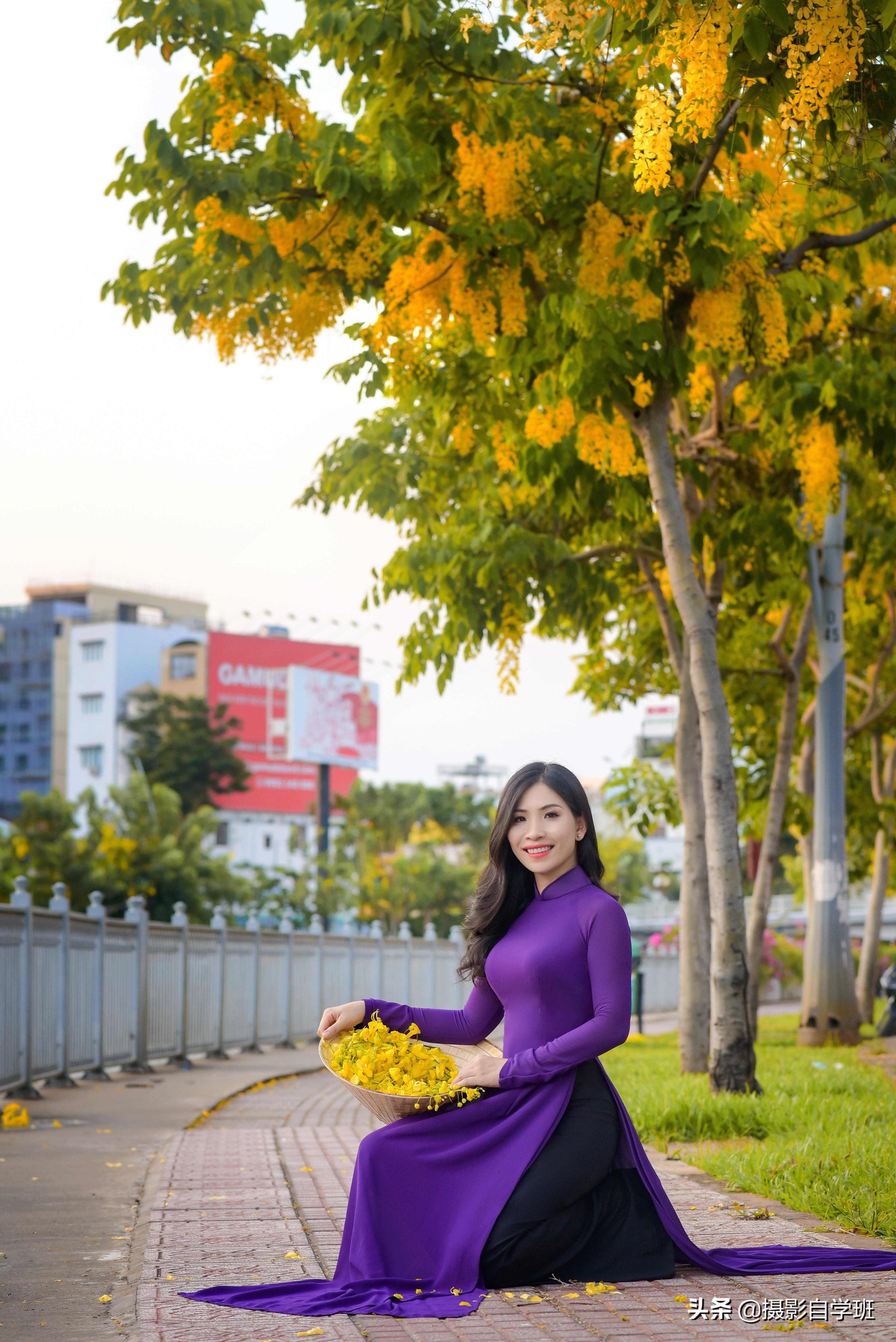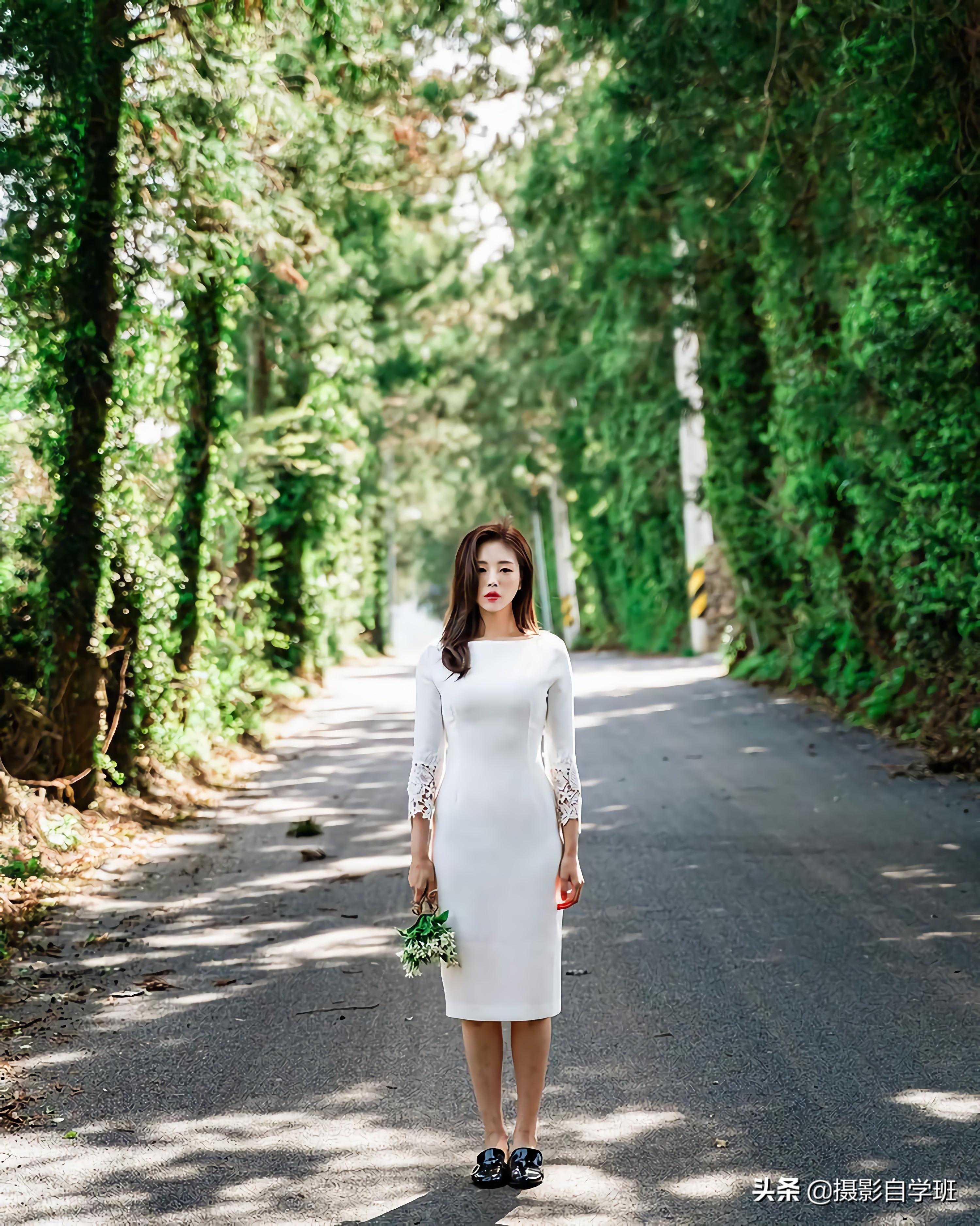 如果在室外路边进行拍摄,俯拍的角度,会让人显得比较小,画面显得比较窄,而如果在路边拍摄,倒不如让人贴着树,站着通过树的挺拔,更能体现出人物身形的修长,体现出曲线美,照片就会更好看一点。