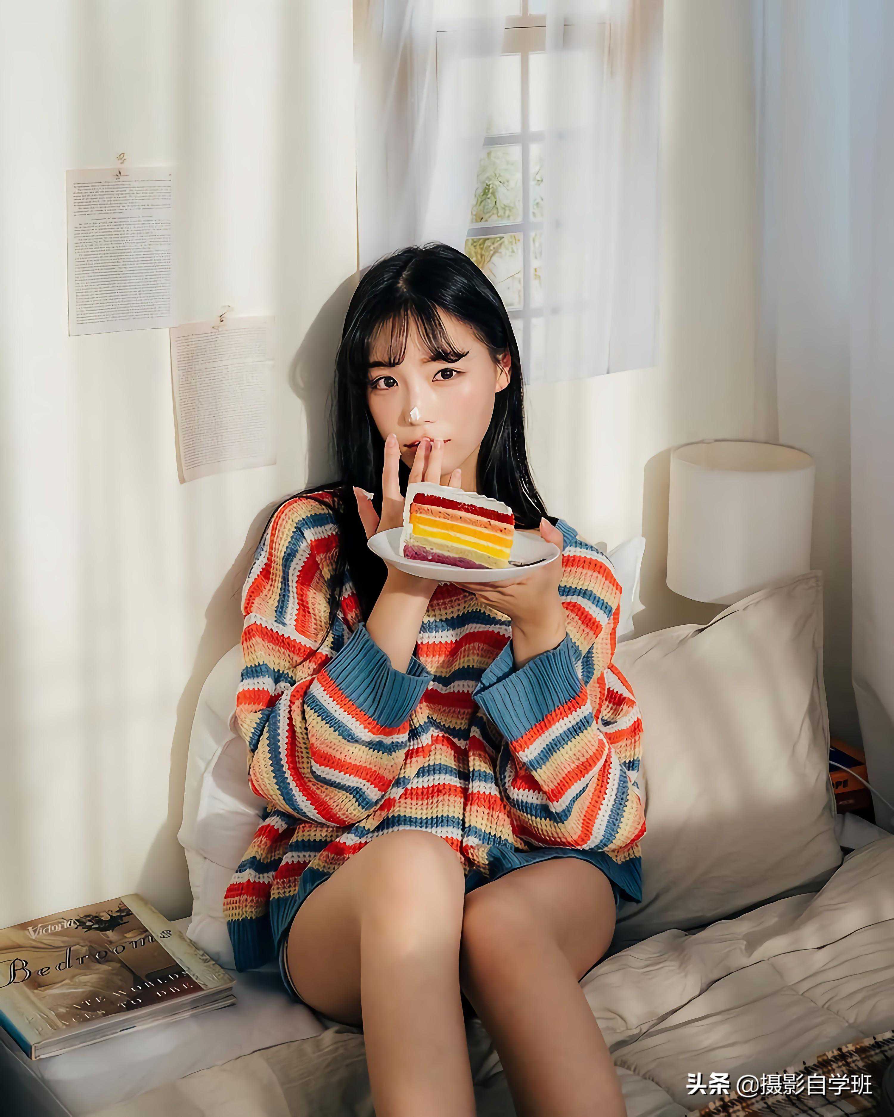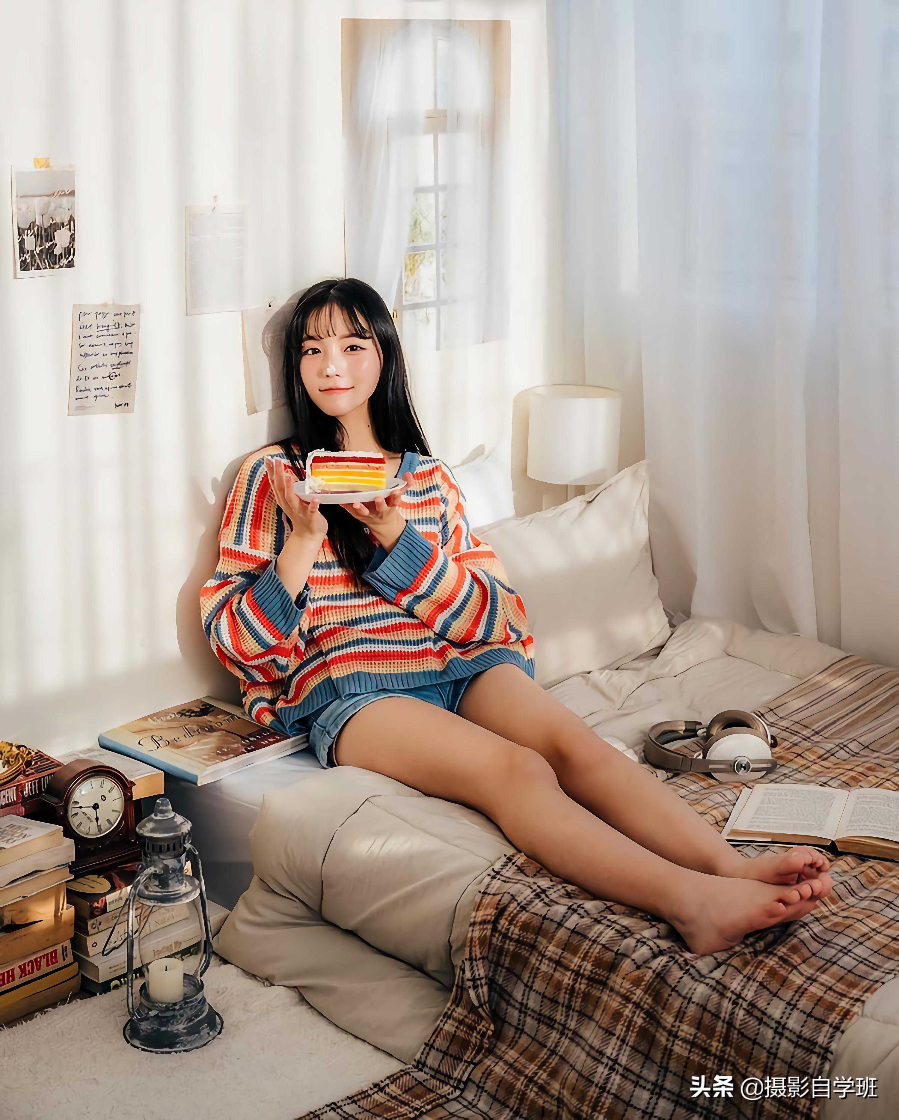 在室内拍摄的时候,可以更好地体现出大长腿,不要像上图这样,弓着腿坐着,而是像下图这样,把腿侧身伸长,大长腿就被拍出来了。