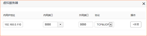 在主路由中设置虚拟服务器,将副路由的WAN口IP地址(本例为192.168.0.110)、远端WEB管理中设置的端口号(本例为8080)映射到外网。