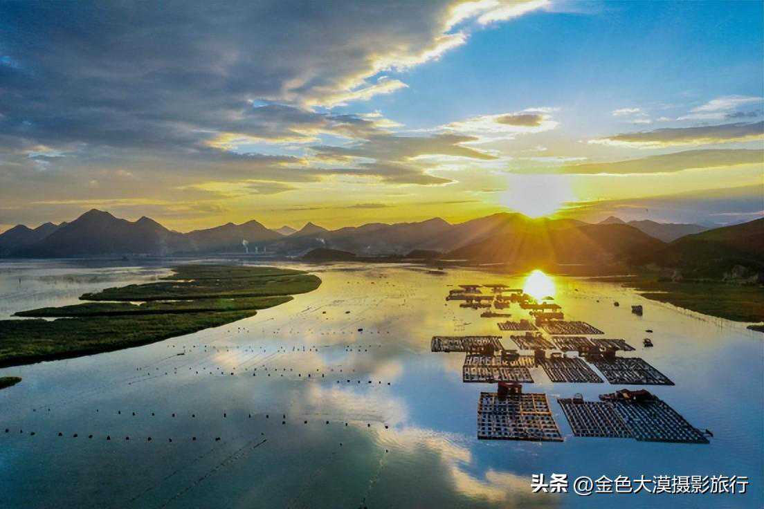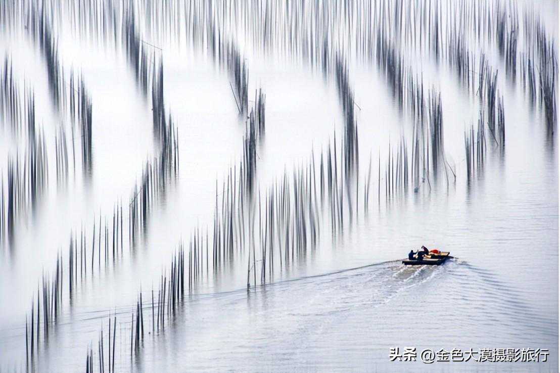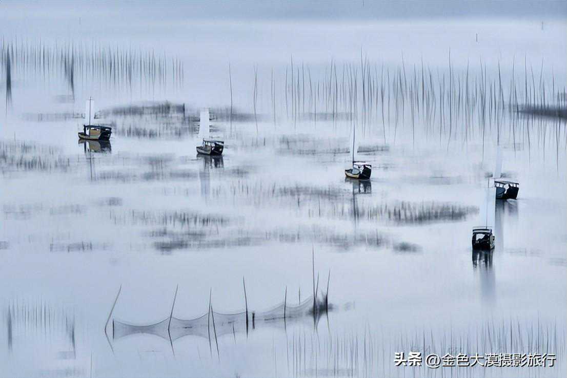 No2:早上五点钟前往花竹村居高临下,鸟瞰大海,水天相连,一望无际。近景浮标竹竿、中景鱼排木屋、远景岛屿帆影,场景井然有序,错落有致。花竹还是观赏"福瑶列岛"全景的最佳地点,尤其日出最为壮美,散射光下,色彩变幻莫测,若适逢云雾飘浮之日,海面上云蒸雾涌,轻盈柔美,福瑶列岛若隐若现,犹如海市蜃楼般迷人。