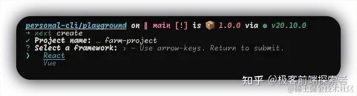 代码逻辑如下,createArgs我们可以传递template参数来指定使用vue或者react等其他框架或者根据prompts来进行手动选择,先输入项目名称,然后选择需要使用的框架,然后就成功啦。