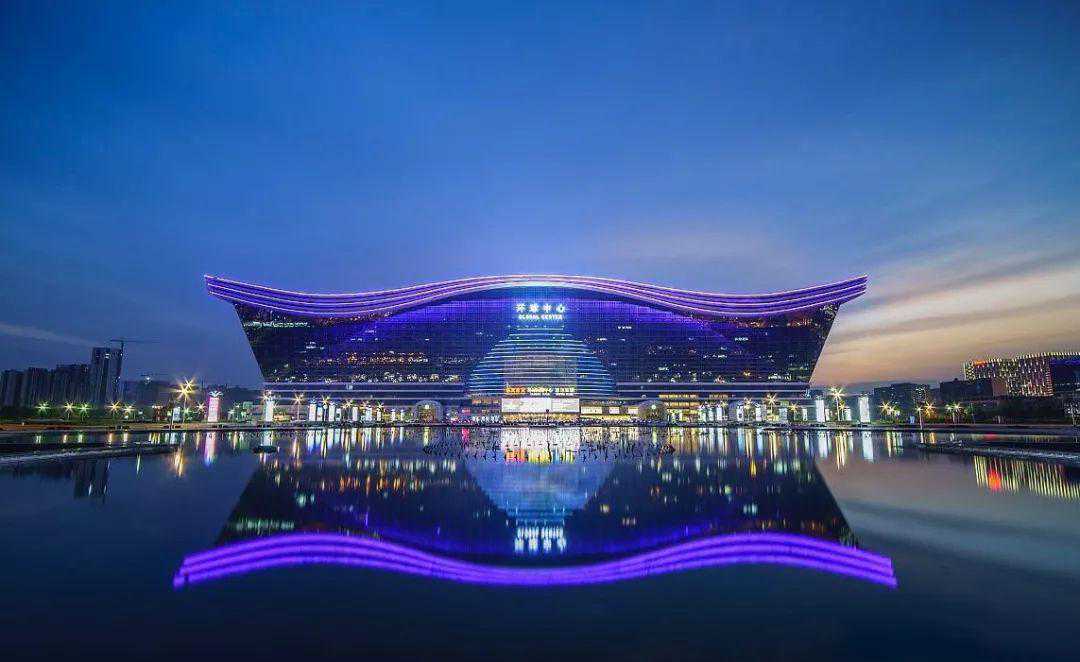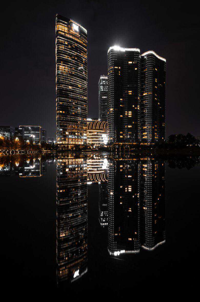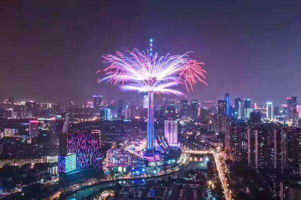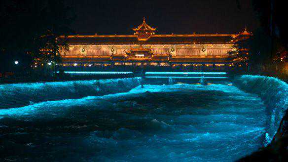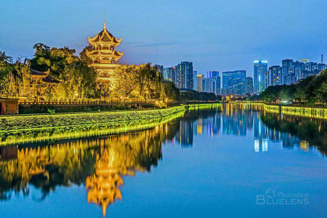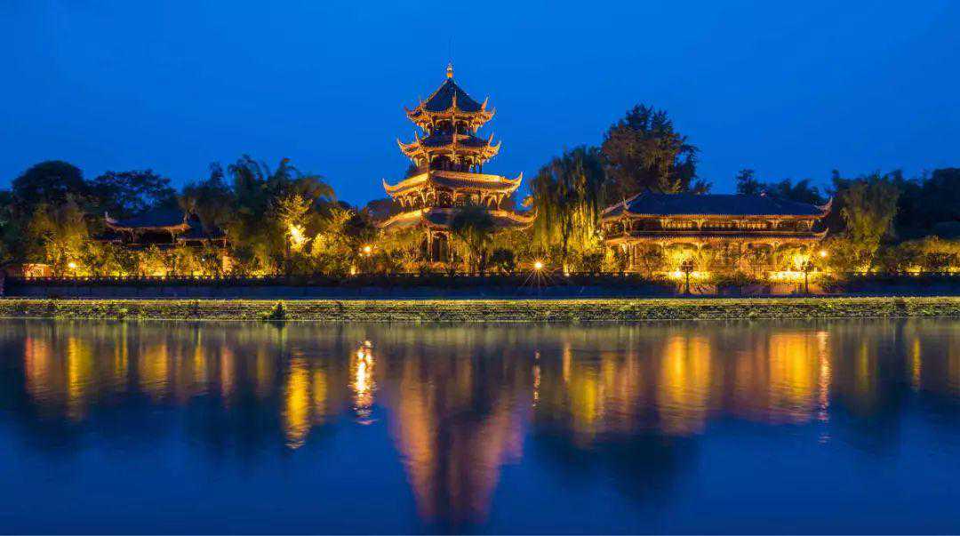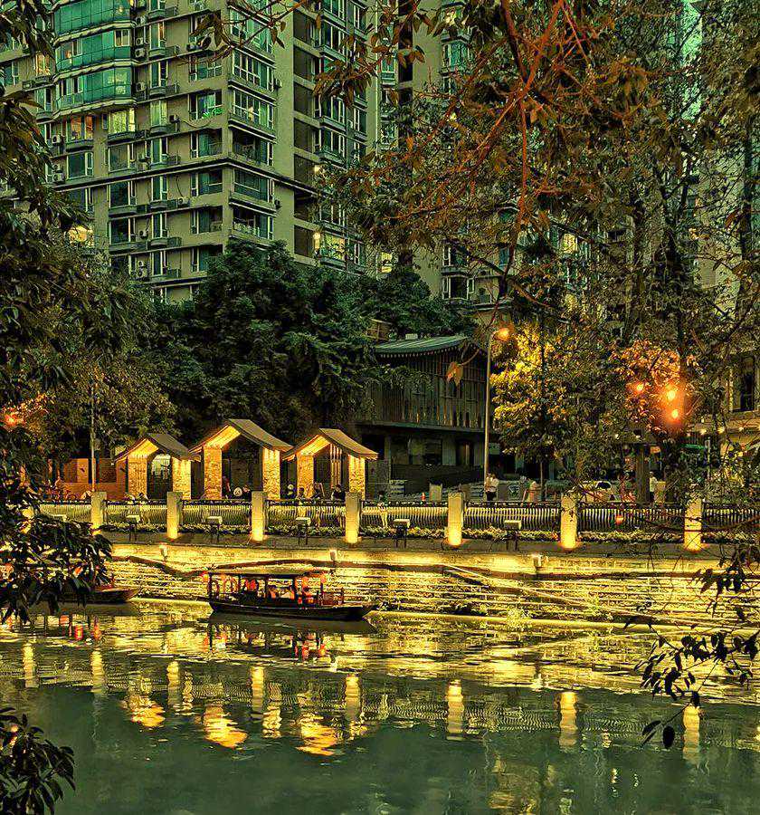 灯光璀璨的它倒影在迷人的府南河上十分靓丽
