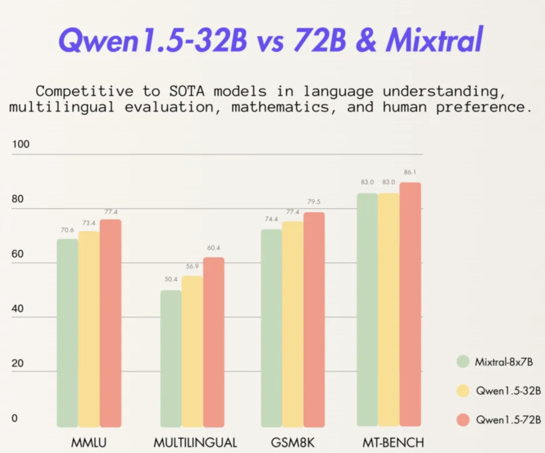 基础能力方面,通义千问320亿参数模型在MMLU、GSM8K、HumanEval、BBH等多个测评中表现优异,性能接近通义千问720亿参数模型,远超其他300亿级参数模型。