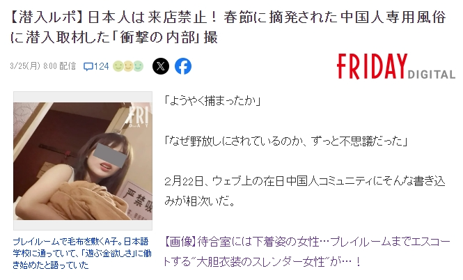 由于客人仅限中国人,不涉及日本人,警方很难发现其中的猫腻。据知情人透露,这样的店铺,在东京都内就有20多家。