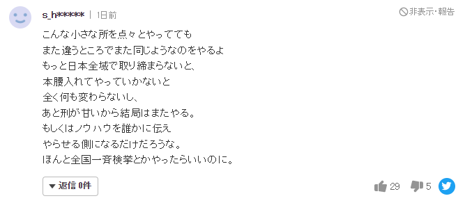 “偶尔才打击一下这种小地方,马上又会在其他地方做同样的事情。如果不在全日本范围内强力打击,什么也不会改变,而且惩罚太小了,结果就是再犯”