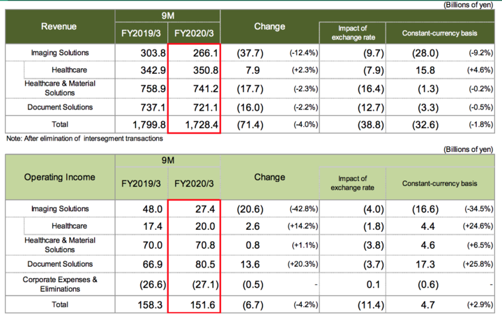 医药保健业务也已成为富士的业务引擎,医疗健康及高性能材料在2019财年前三季度(2019年4月1日-2019年12月31日)销售额达68亿美元,占总营收42.88%,远超传统影像业务的24.41亿美元,以印刷系统、打印机为主的文件处理业务则成为另一个重要的业绩支柱。