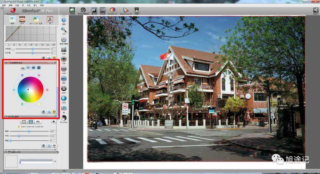 在SilverFast软件操作界面的左侧竖向菜单里有个吸管工具,也就是白平衡选项,默认是自动。“白点”可以吸取照片中的至亮点,这个一般不使用,因为照片都不一定会有最亮的部分;“中性点”是最常用也是最重要的工具,吸取画面中中性灰的地方,如果一个拿不准是不是中性灰,就多吸几个,可以在一张图中同时吸取4个参考中性点来达到尽可能准确的白平衡;“黑点”是吸取照片中的至黑点,一般来使用它吸取胶片片基。对于这张照片,我认为沥青路面为画面中中性灰的地方,然后使用“中性点”吸取一点,基本可得到较准确的白平衡。