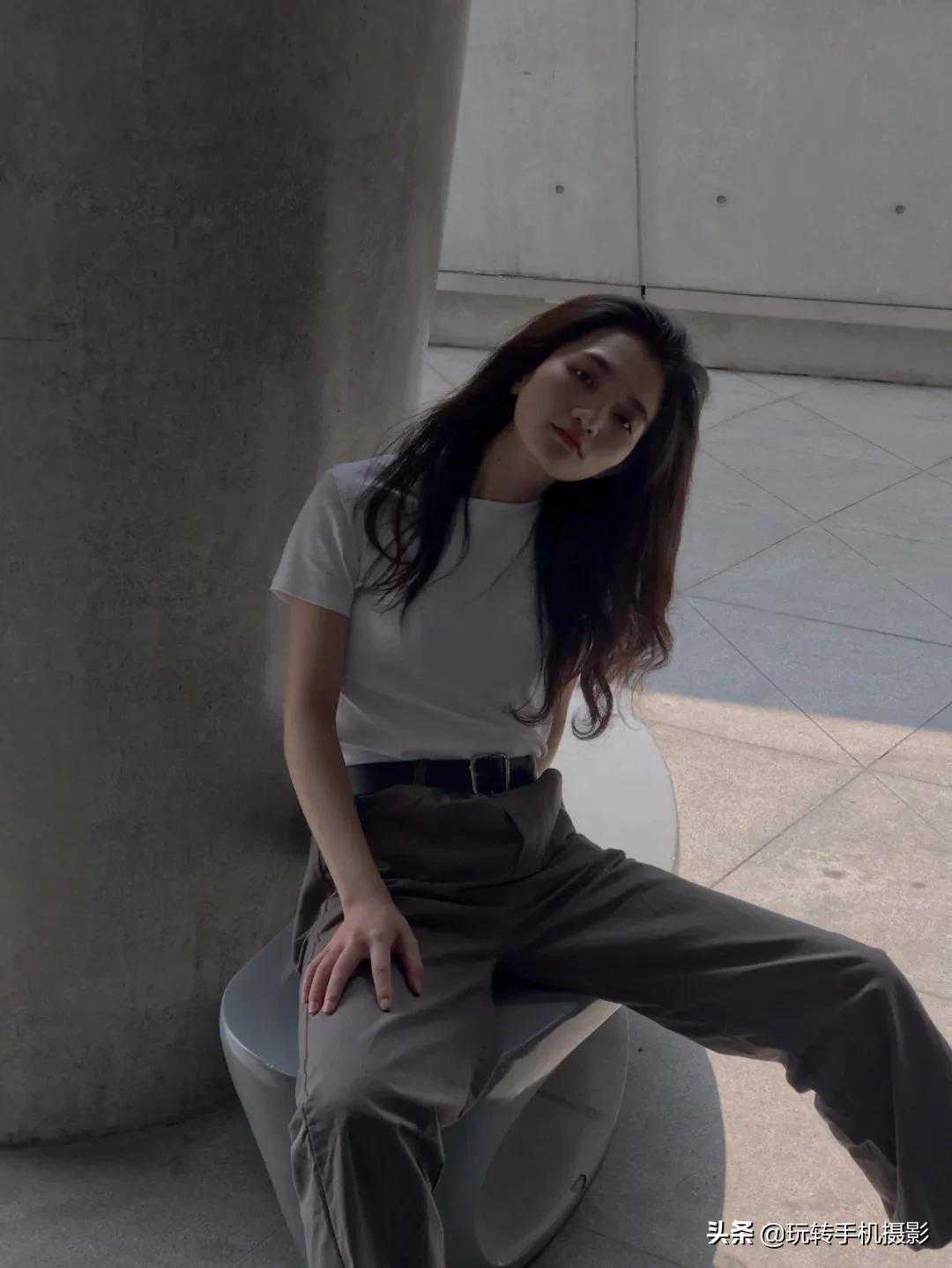 同样的场景,我们让七七坐下撩头发时,会形成三角形轮廓,这样的画面很有线条感,人物也会有一种硬朗的风格。(手机画面贴住脚拍摄会有视觉冲击感)