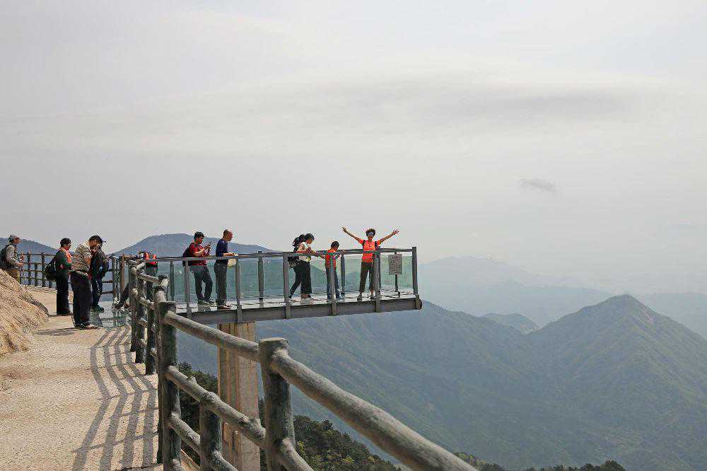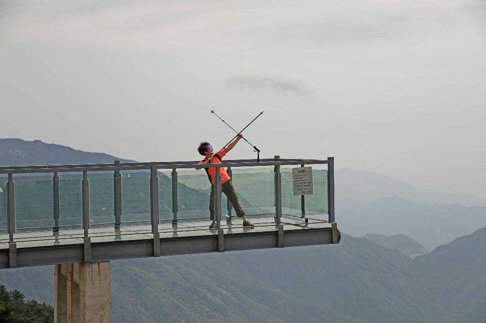约两三个小时后,我们陆续登上连接主峰的栈道,栈道上有玻璃观景台。站在观景台上,巍巍群山尽收眼底,只见远山苍茫,层峦叠嶂,山下的张家咀水库如碧玉镶在天边,好一幅山水大轴啊!