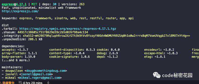上面的过程简要描述了npminstall的大概过程,这个过程还包含了一些其他的操作,例如执行你定义的一些生命周期函数,你可以执行npminstallpackage--timing=true--loglevel=verbose来查看某个包具体的安装流程和细节。