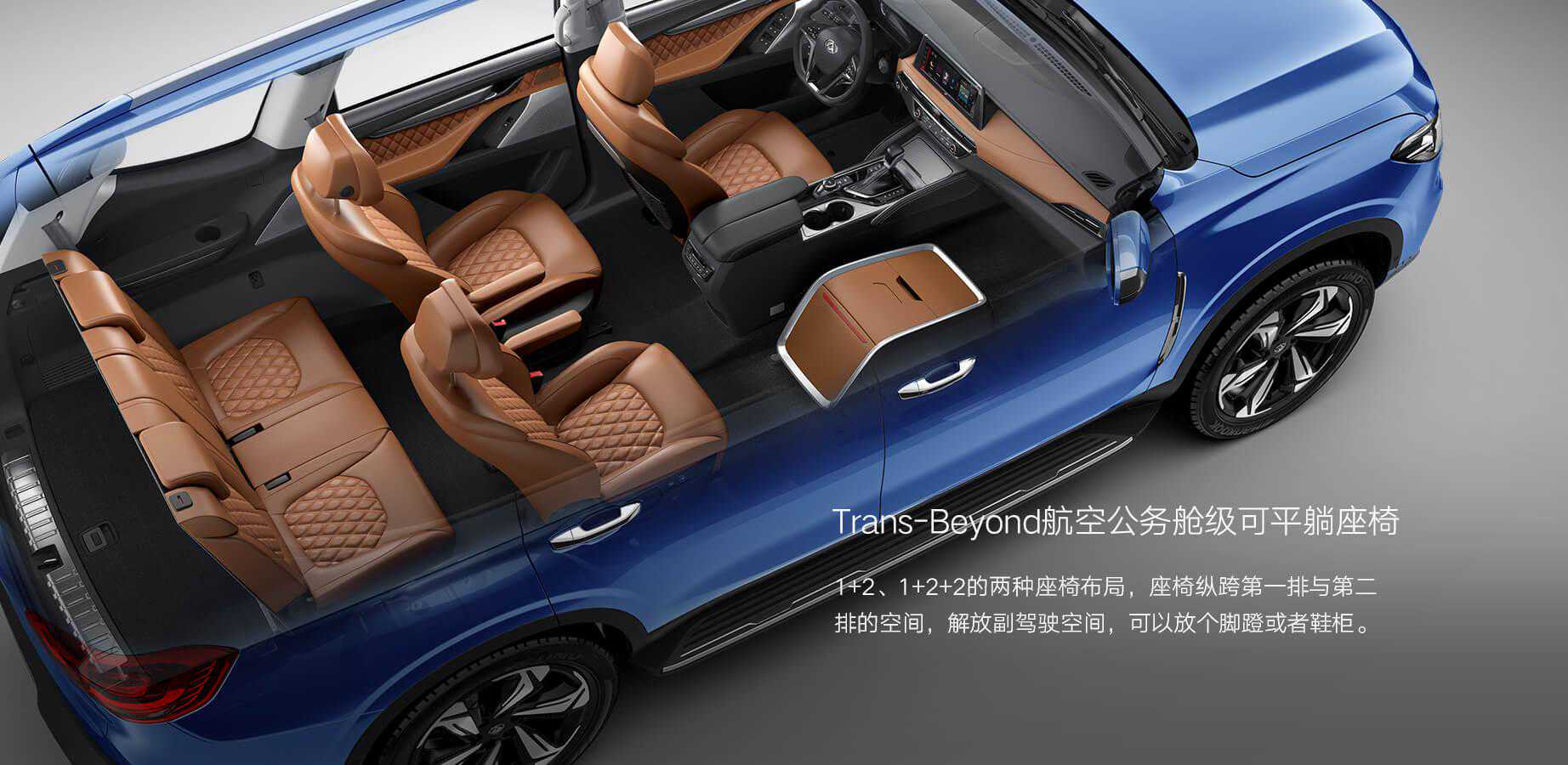 空间部分是大通D90的亮点,因为它提供了2+3+3的八座车型,同时还有一个Trans-Beyond公务舱级平躺座椅,支持1+2/1+2+2两种布局,商务气息更浓。但是我们实际的拍摄车却是一辆五座版车型,所以空间展示只能是这样。