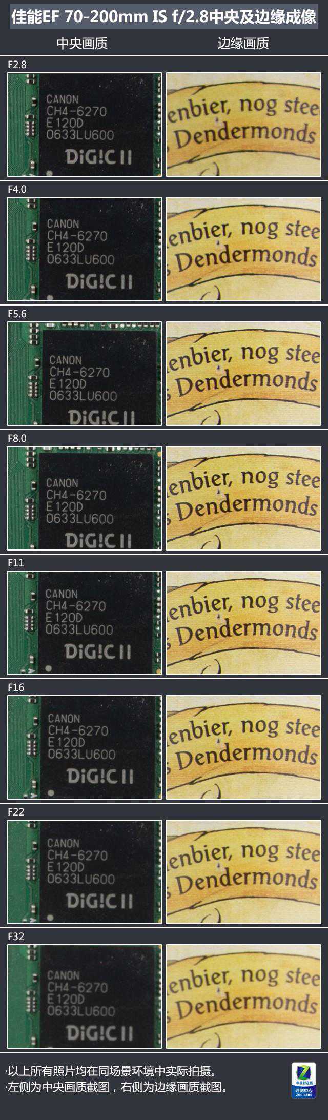 先来看看70mm端的表现,70mm端从f/2.8全开就展现出了不俗的画质表现,无论是中心还是边缘都展现出了相当良好的表现。而镜头在缩小到小光圈后依旧有非常好的成像素质。从f/4.0-f/11基本都是镜头的最佳成像区域,从f/16开始镜头锐度和清晰度开始下降,但可以看到即便是收缩到f/32,镜头70mm端的可用性也依旧不错。