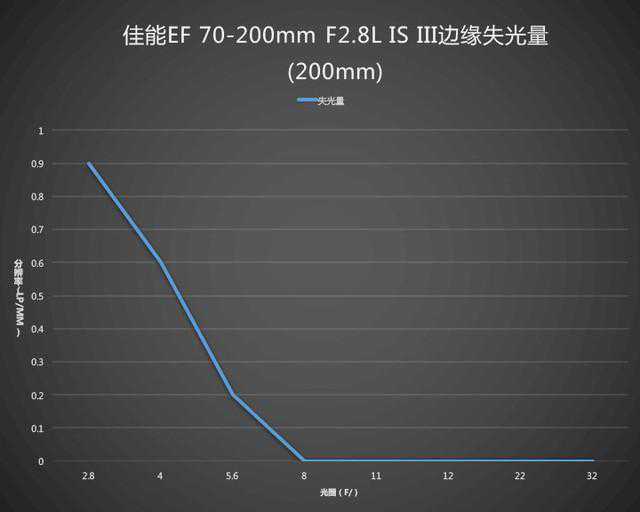 接下来再来看看暗角控制方面,首先是70mm端。可以看到70mm端这枚EF70-200mmf/2.8LISIIIUSM镜头的暗角控制是很不错的,在f/2.8下有轻微暗角,而随着光圈收缩一档光圈后会大幅度降低,而到f/8.0后基本没有边缘暗角的问题了。