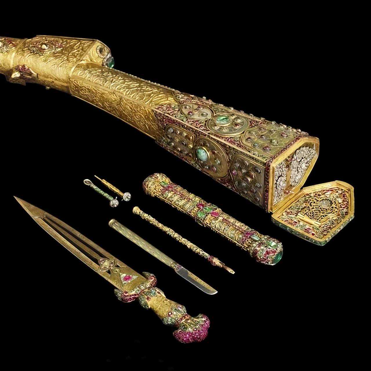 套装包括镶嵌宝石的枪支、笔筒、勺子、火石清洁剂、笔筒中的芦苇笔、削笔刀和匕首。它由钢、木头、金线、镀金、银、和田玉、钻石、红宝石(或尖晶石)、翡翠(或绿柱石)和芦苇尖制成。