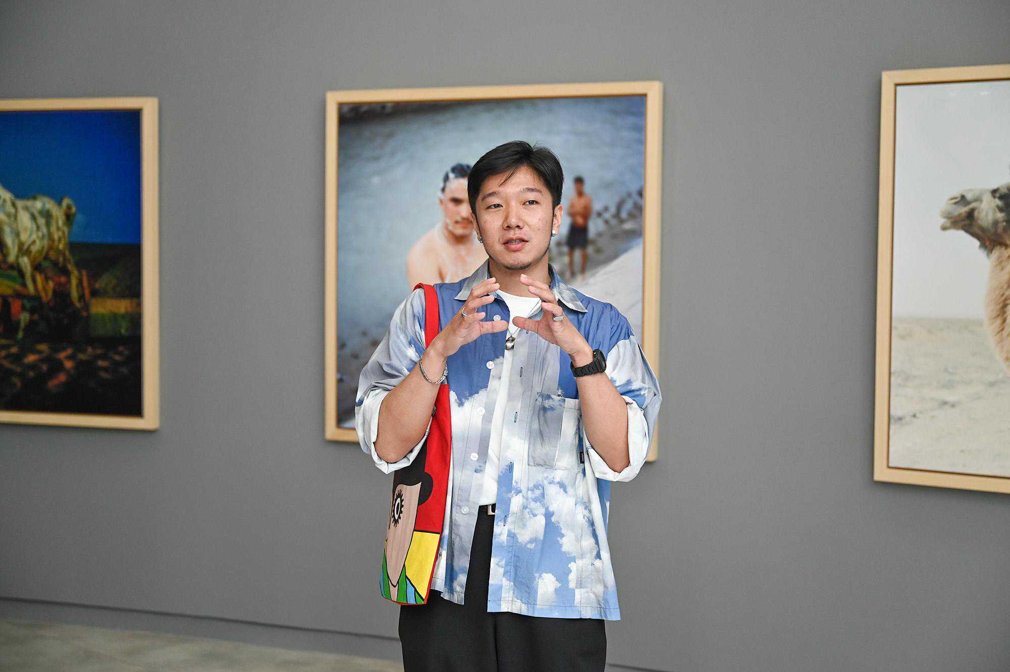 “自我:新纪实摄影”,展览现场。摄影师张博原介绍自己作品。澎湃新闻记者吴栋图