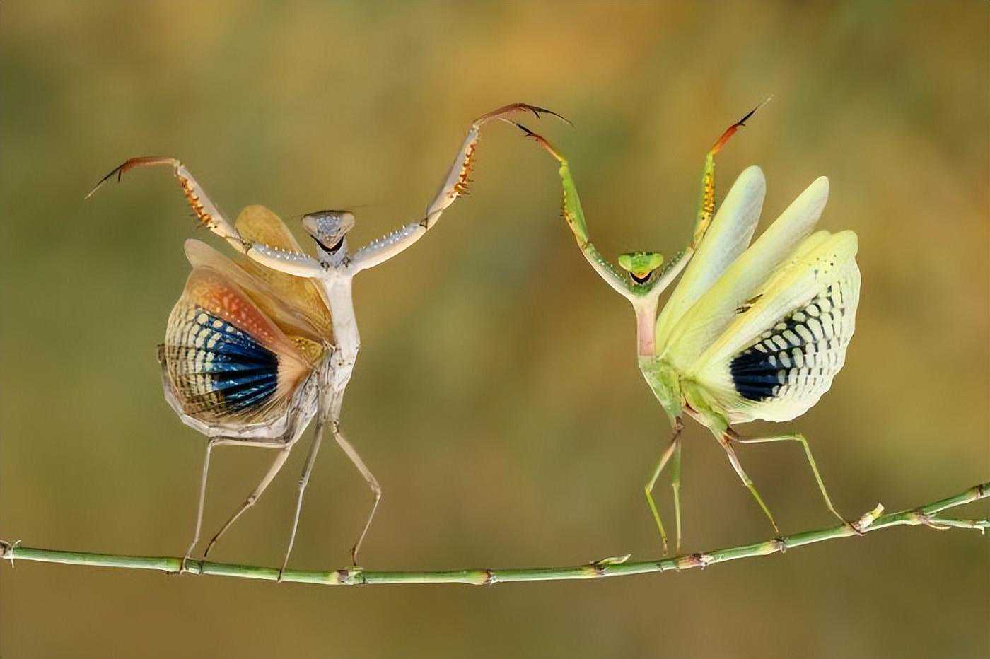 这是螳螂的正常行为。它们在进行防御。当它们害怕时,会举起前肢,展开翅膀。它们看起来就像是微笑的舞者。
