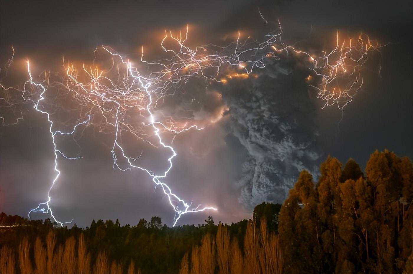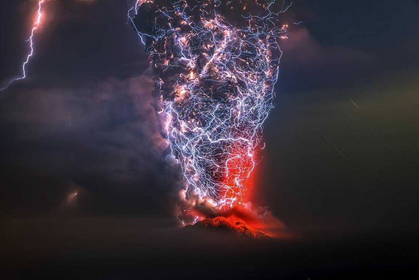 这张照片是在智利拉各斯地区卡尔布科火山夜间猛烈喷发时拍摄的。一场难以置信的尘暴笼罩着喷发火山的喷口。