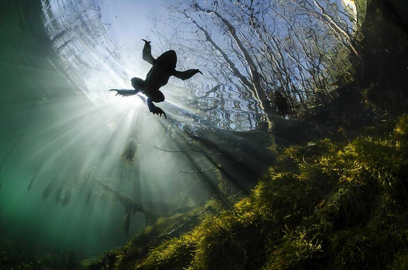 二月,普通的蟾蜍开始回到河里繁殖。到那时,这条小河的冰水已经足够清澈,非常适合水下摄影。这张照片是在自然光和呼吸暂停状态下拍摄的。我选择黑光,以从淡水中评估这一标志性物种的价值。