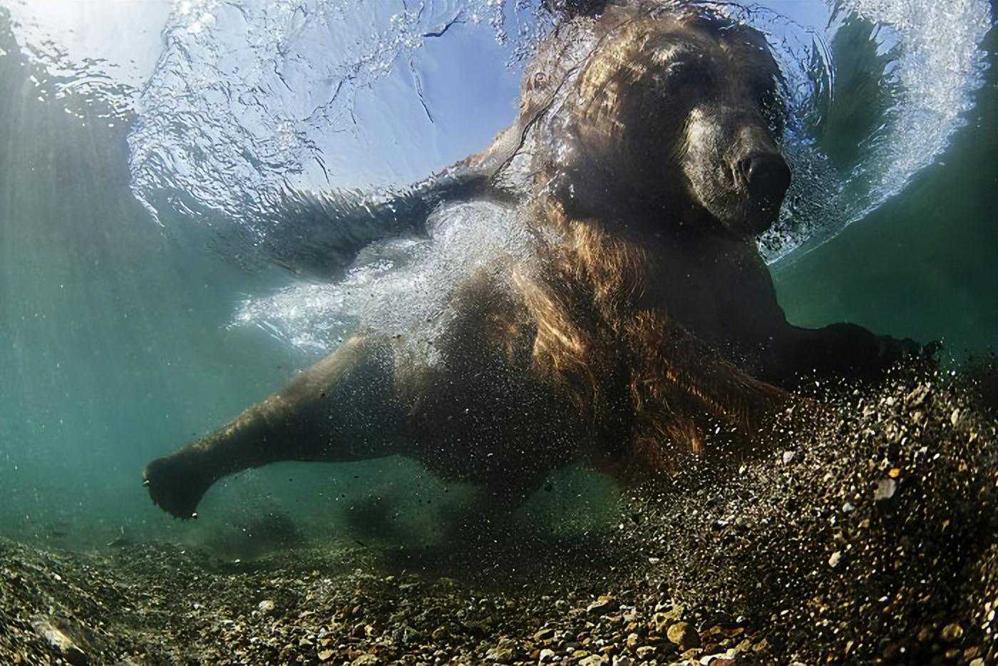 熊在河里捕鱼,它坐下来,把头埋在水下,停下来找鱼。一旦鱼开始忽视它,走近它,它就做出关键的弓箭步,用爪子或牙齿抓住。