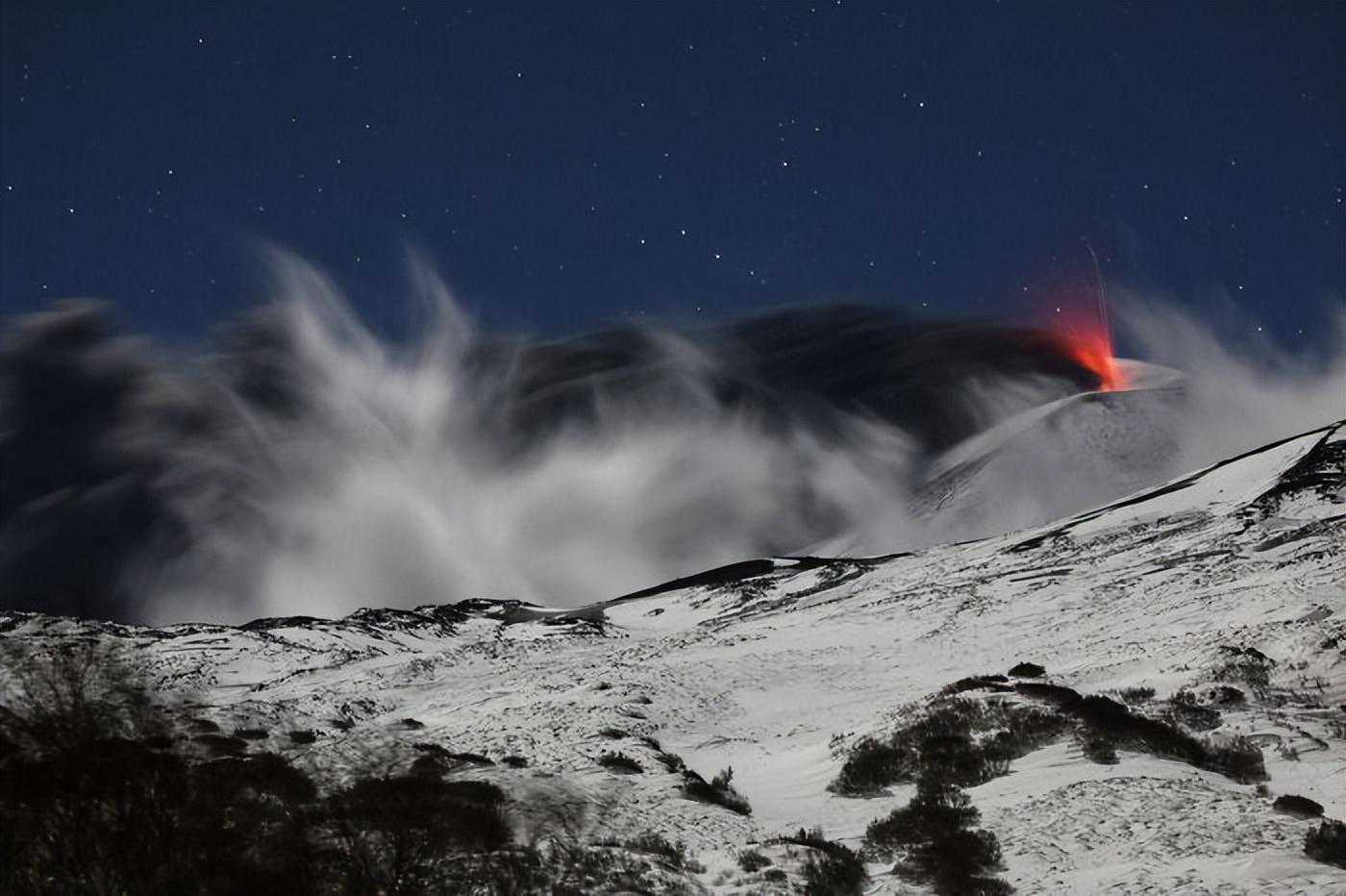 埃特纳火山在2021年12月爆发。爆炸性火山碎屑物质在黑暗的天空中喷出一团黑色的火山沙,与漂浮的云层形成了惊人的对比。这张长曝光照片还捕捉到了月光和星星照射下的雪景。