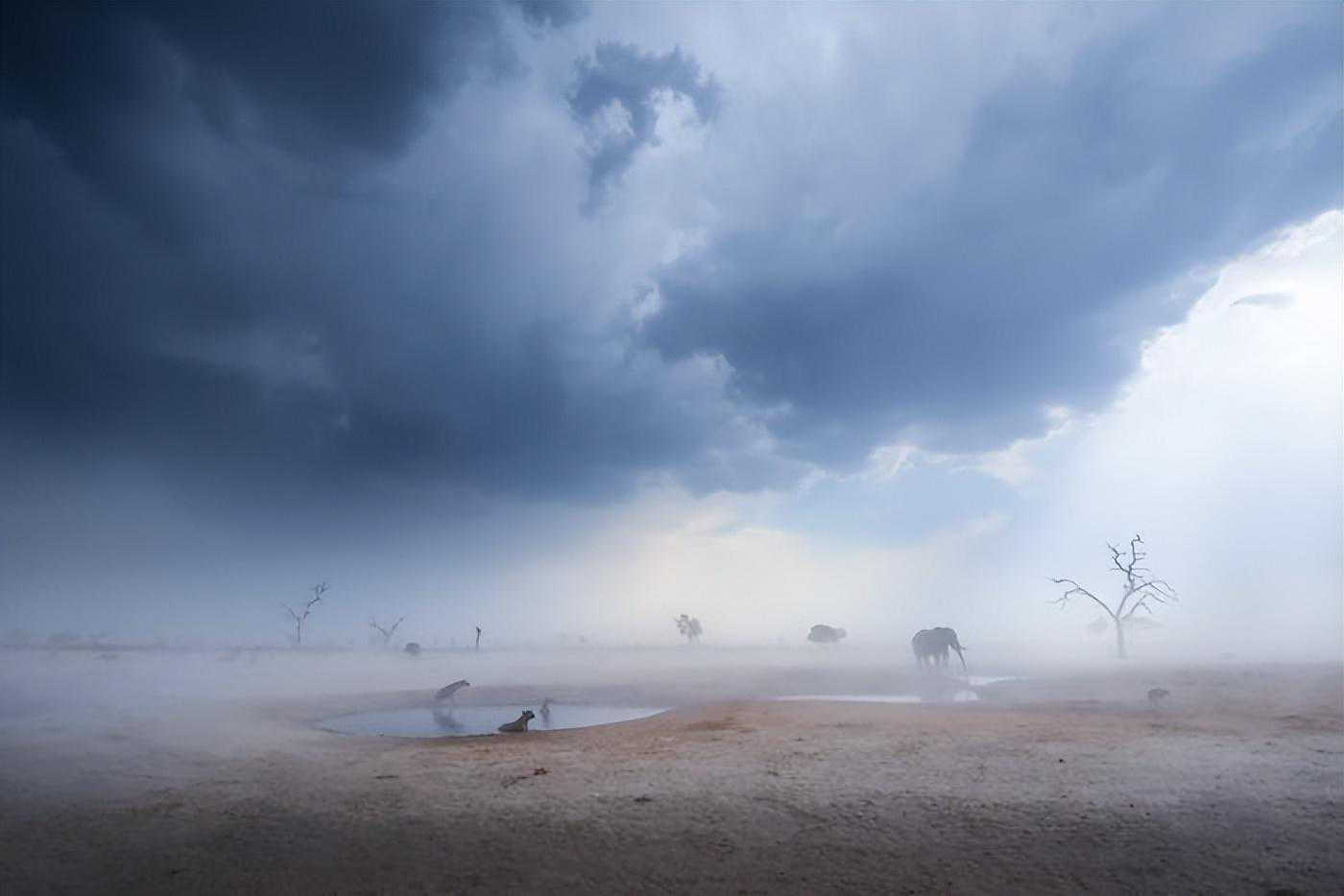 在炎热潮湿的午后,三只鬣狗、一只豺狼和两只大象忍受着沙尘暴,天开之前风就刮起来了。鬣狗在冷水中消暑并驱除寄生虫。旱季已经结束,雨季即将到来,干旱的乔贝国家公园里的每只动物都有望得到缓解。