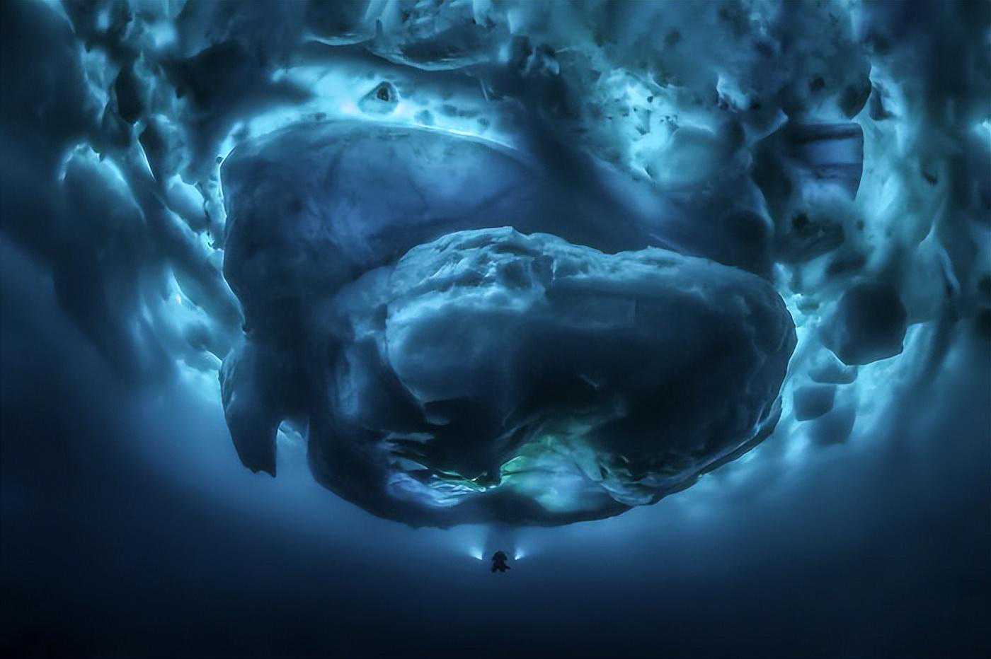 在格陵兰岛东部零下2摄氏度的温度下夜间潜水,在峡湾冰层下的冰山中游泳。