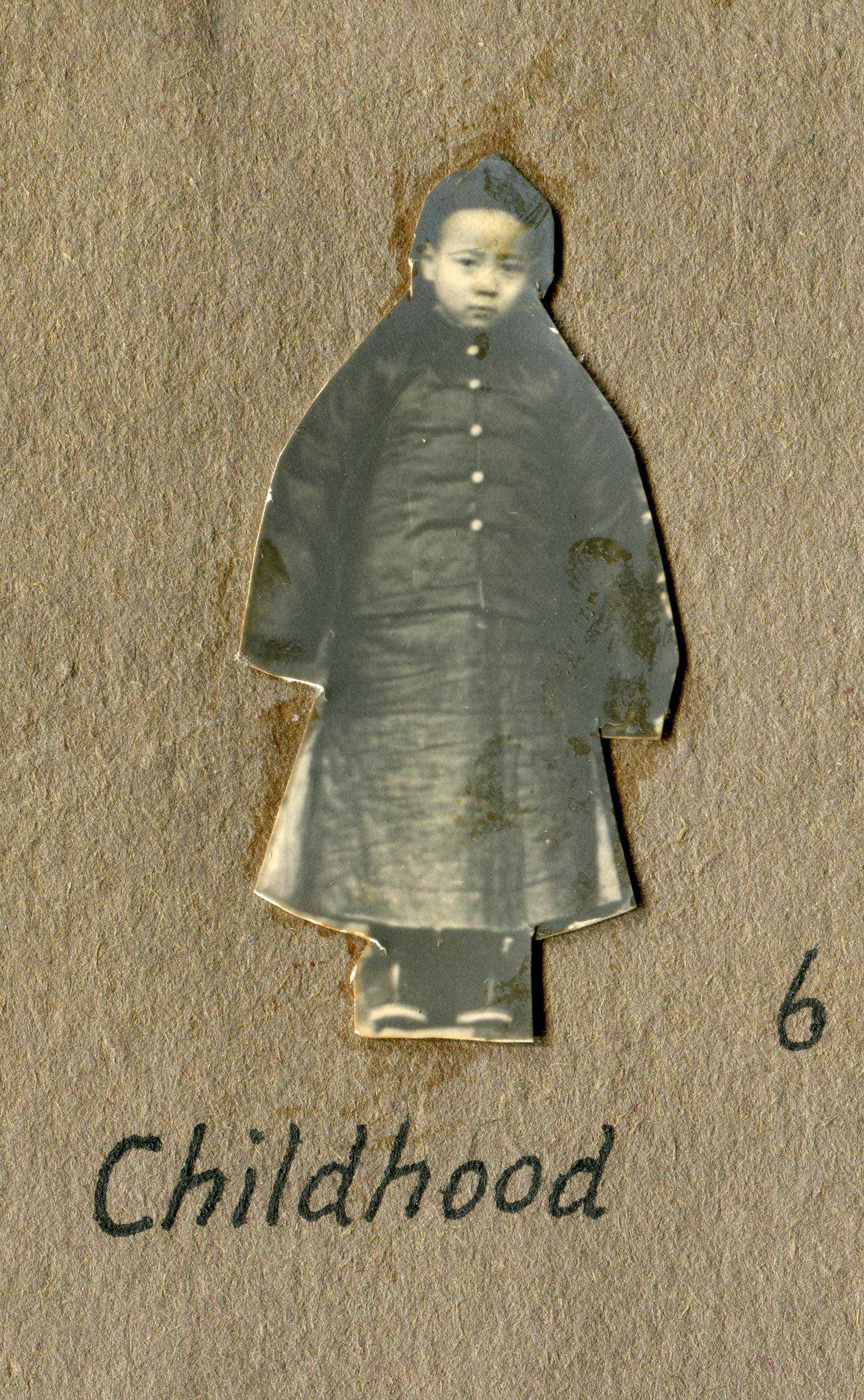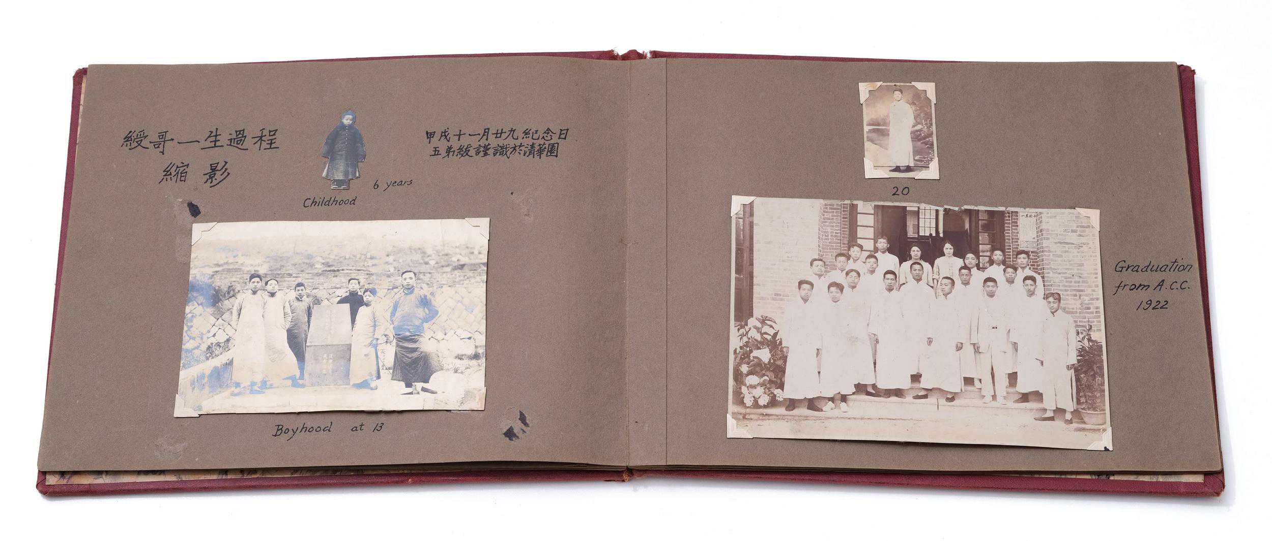 翻开相册,一个孩子身着袍褂,一脸稚气,他的身形被从一张更大的照片上剪下,成了一枚更小的照片。照片底下用英文写着:童年,6岁。这枚小照片贴在相册第一页偏上居中位置,左右还有两行字,左书:绶哥一生过程缩影。右书:甲戌十一月廿九纪念日五弟洪绂谨识于清华园。“这本相册应是甲戌年(1934)年所制。”池志海说。