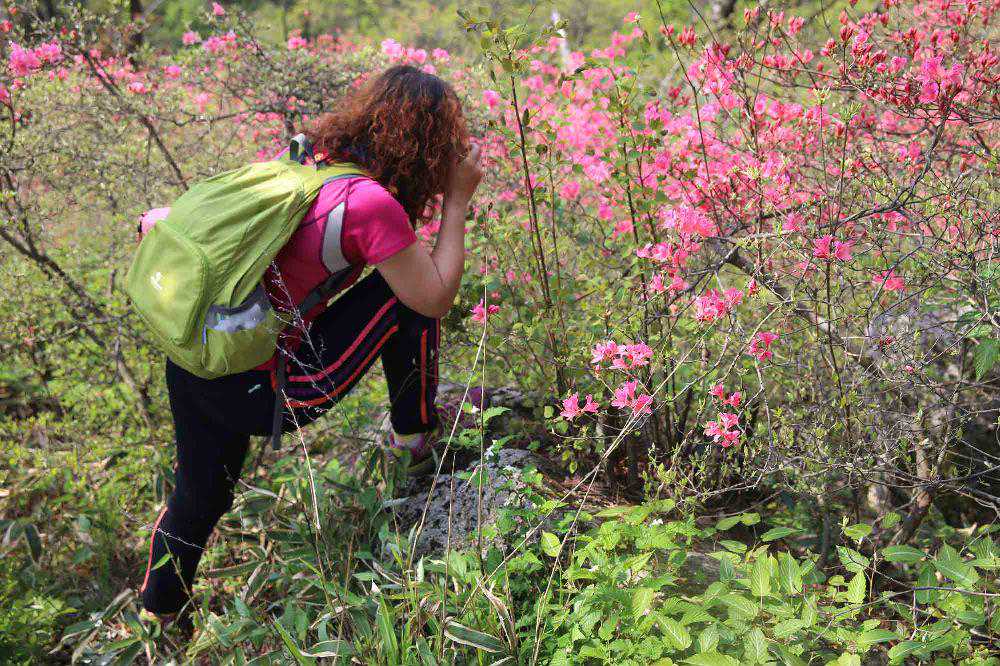 好在满山的杜鹃花儿处处露出笑脸,密林深处时时传来各种鸟叫,叽叽咕咕地鼓励我们。除了我们常见的杜鹃花,这里还生长着大别山特有的杜鹃品种“云锦杜鹃”,大朵大朵的花儿,很类似粉白色的芍药花。随着海拔的不断升高,在山脚还盛开的杜鹃,在山顶竟是含苞待放。有人唱起山歌来:“夜半三更盼天明,寒冬腊月盼春风;若要盼得红军来,岭上开遍映山红!”好一首应景的歌!杜鹃花不正是“映山红”吗?