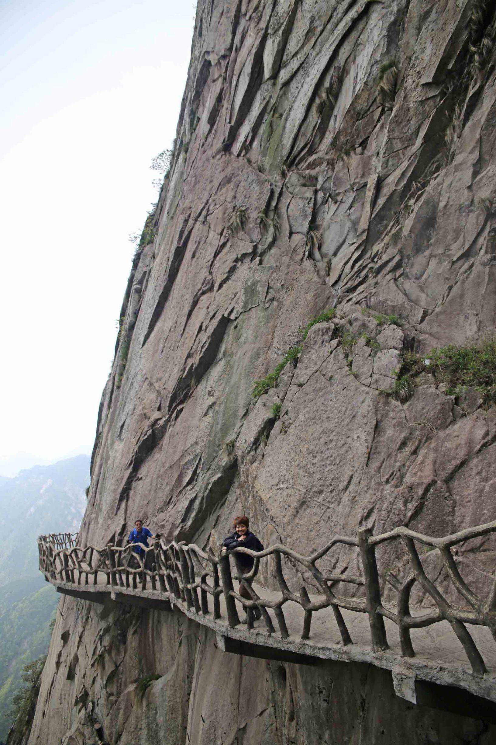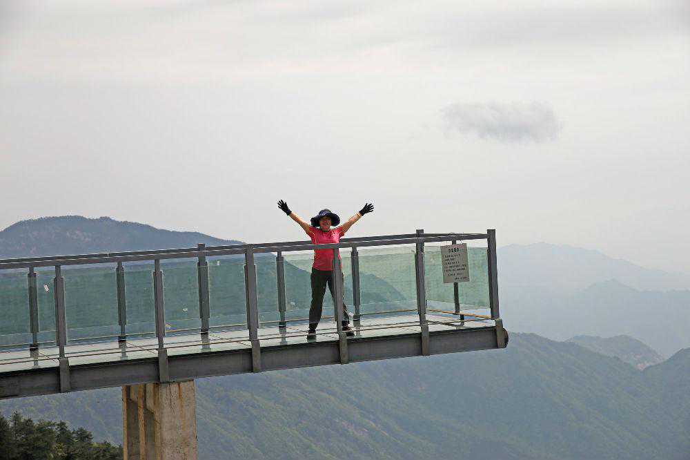约两三个小时后,我们陆续登上连接主峰的栈道,栈道上有玻璃观景台。站在观景台上,巍巍群山尽收眼底,只见远山苍茫,层峦叠嶂,山下的张家咀水库如碧玉镶在天边,好一幅山水大轴啊!