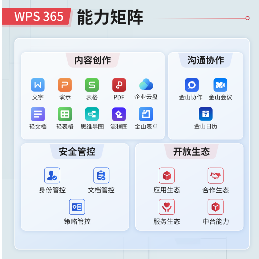 2023年4月,金山办公面向政企客户发布了数字办公品牌WPS365.该服务提供一系列内容创作应用和办公协作工具,涵盖了内容创作、沟通创作、数字资产管理、开放生态四大版块,包含WPSOffice、文档中心、金山协作、金山会议、邮件、日历等通用办公套件。