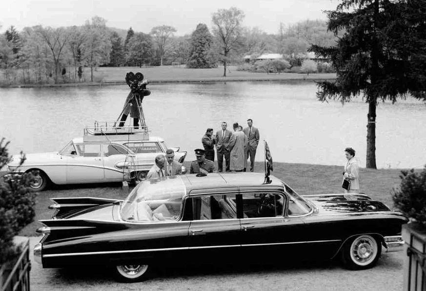 1959年凯迪拉克75凯迪拉克上百年历史中,1959年无疑属于“巅峰岁月”,当年旗下各车型的尾翼造型夸张至极,如今仍是人们津津乐道的经典。作为长轴距旗舰,1959年75系列长达6.2米,轴距3.8米,宽2米,高1.5米,配备6.4升V8,自重2.6吨,看起来像个逍遥张狂的大飞船!伊丽莎白二世1959年访问北美,通用展开