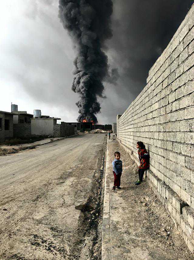 获奖者说:“孩子们在伊拉克卡亚拉镇的街头游荡,身后不远处,被IS武装分子烧毁的油井正在冒着浓烟。”
