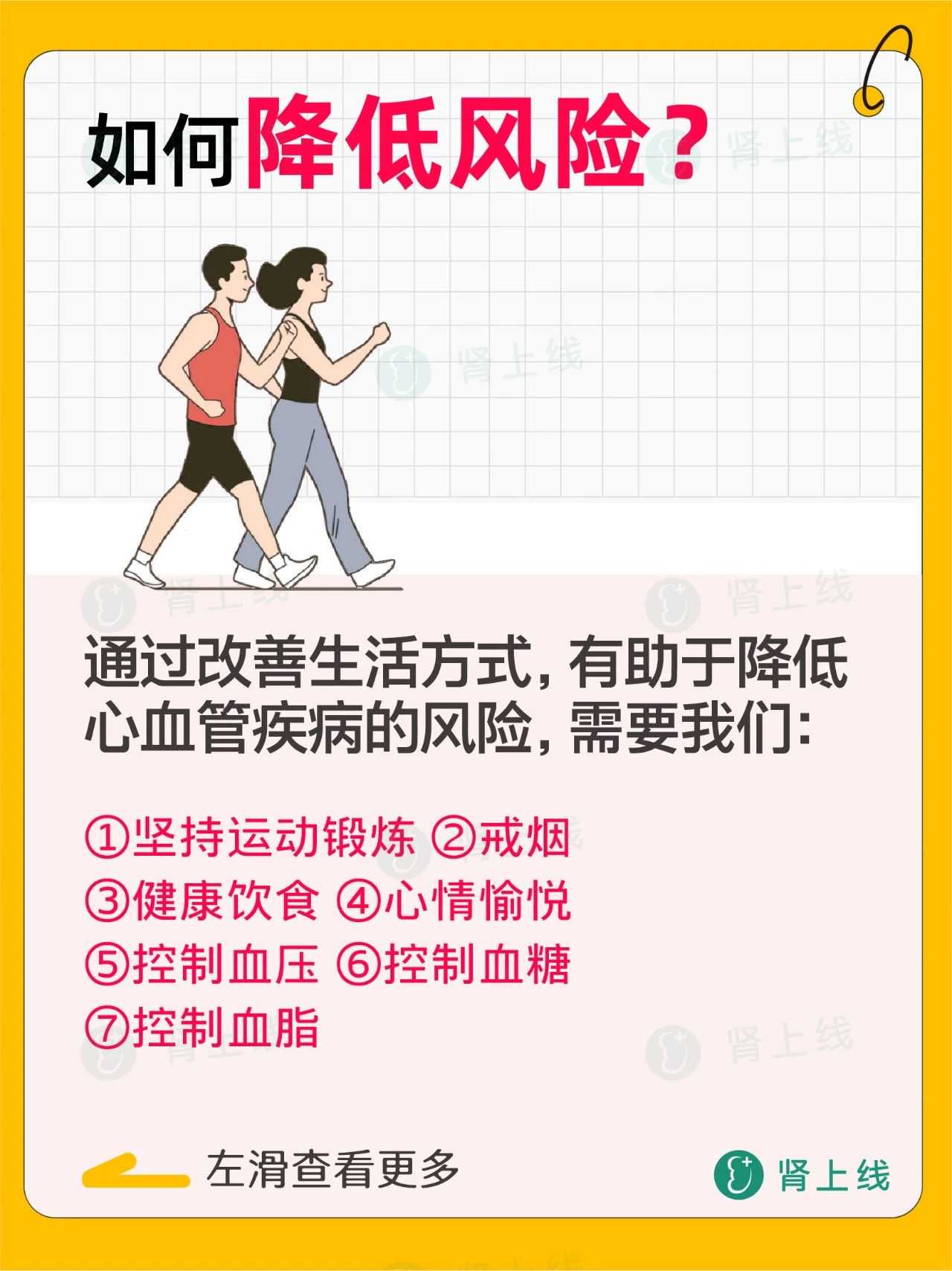 所以,肾友们想要健康长寿,提高对心血管疾病的早期防控意识至关重要。坚持运动锻炼、戒烟、饮食健康、舒缓情绪、控制好“三高”--高血压、高血糖、高血脂,都是我们保护心血管的关键。