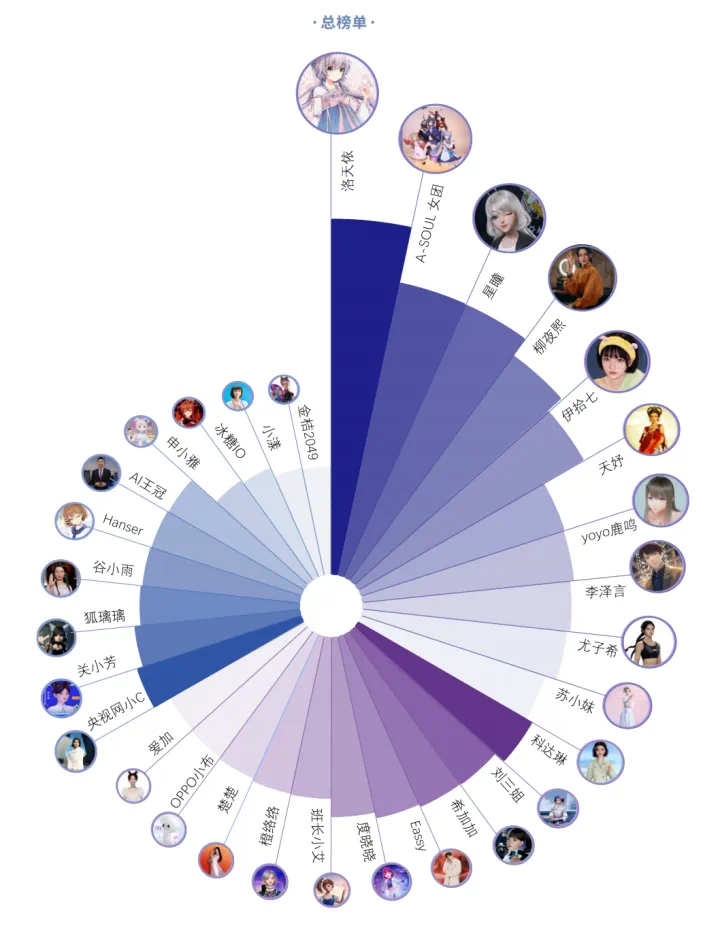 2023年度虚拟偶像总分TOP10:洛天依、A-SOUL、星瞳、柳夜熙、伊拾七、天妤、YOYO鹿鸣、李泽言、尤子希、真的是苏小妹。