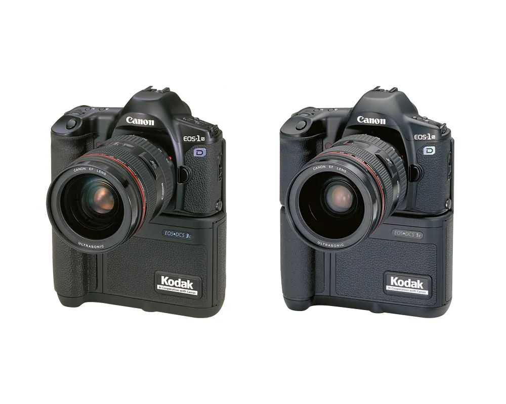 其中,EOSDCS3和EOSDCS1两款发布于1995年的产品换皮换的不太彻底,这两款由柯达提供传感器的相机上面居然还有柯达的logo。EOSDCS3发布于1995年7月,采用一块面积约为16.4×20.5mm,约130万像素的CCD图像感应器,焦距换算倍率约为1.7倍,也就是说传感器面积比佳能后来常用的15mm×22.5mm的APS-C传感器还要略小一些。EOSDCS1发布于同年12月,采用了属于APS-H画幅的18.4mm×27.6mm、更大的传感器,约600万像素。
