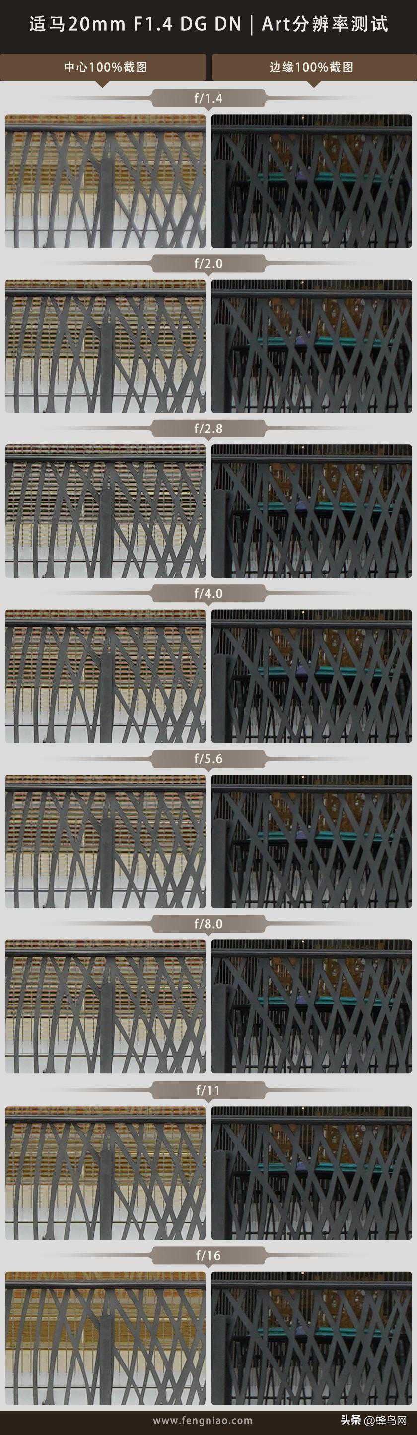 通过实际拍摄截图,可以发现适马20|Art这支镜头在光圈全开的情况下,中心和边缘画质稍微有一些偏软,但整体细节刻画能力还是相当不错的,收缩一档光圈至后,画质得到了一定程度的提升,随后画质一直保持在一个相对稳定的状态。