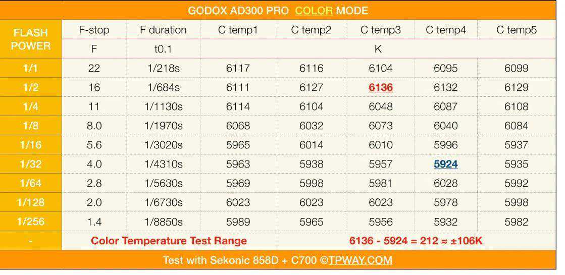 AD300pro采用了跟AD200pro相同的两个模式,即普通模式和色温恒定模式。普通模式下闪光持续时间略高一些。色温测试最高一次6249K出现在1/2功率,最低一次6012K出现在最低功率1/256。纵向功率差237K约等于±179K。