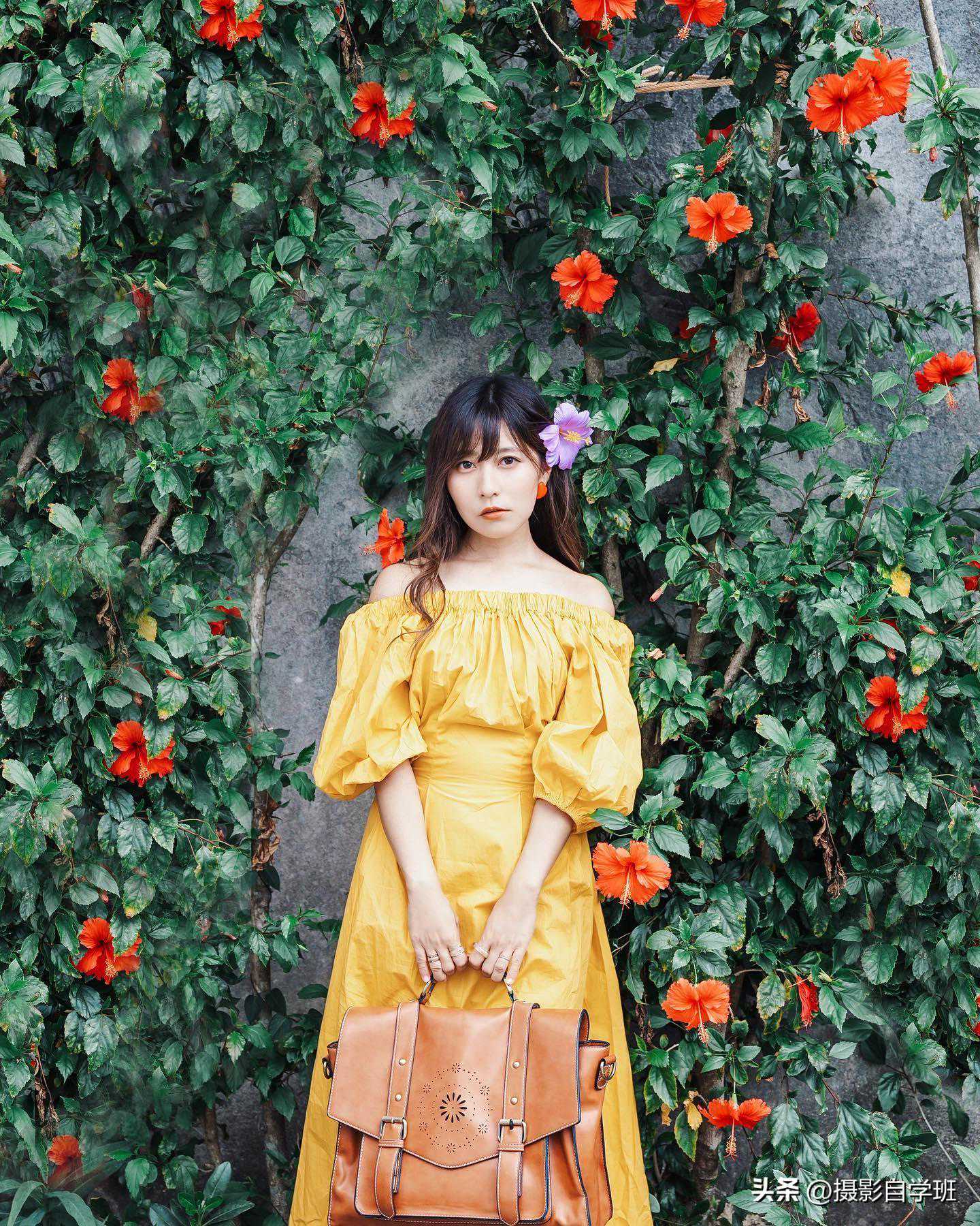 让人站在树叶或者花朵的中间,像图1、图10、图11这样,花朵和树叶,可以营造出一个自然的氛围,同时还能为照片增加生动的色彩。