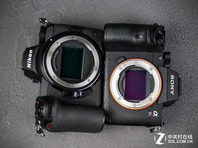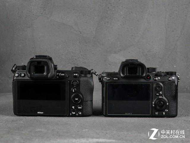 尼康Z7和索尼A7RIII,在体积上基本差不多,机身正面卡口上尼康Z7采用了全新的Z卡口,内径为55mm,而索尼A7RIII的FE卡口内径为46.5mm,从卡口上能明显看到尼康Z7要大很多。当然,两台相机在正面的差异更多是机身设计上的差异,更大的区别集中于按键与功能设计。
