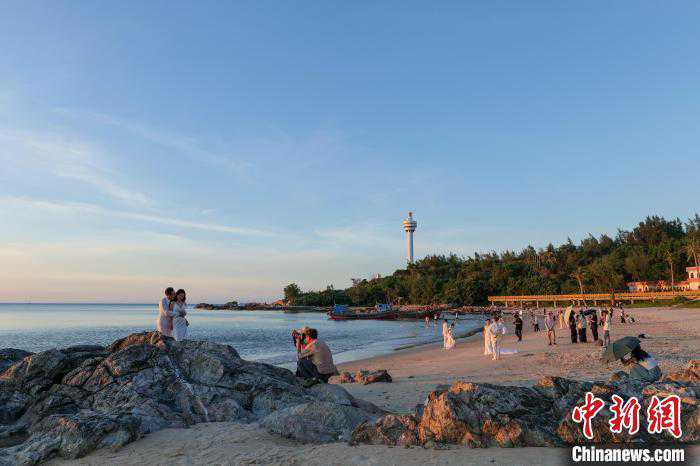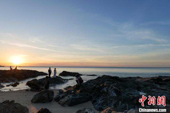 7月23日,海南文昌木兰湾海边,美丽的日落风光吸引许多新人在此拍摄婚纱照,浪漫的海景见证着他们的浪漫幸福。(凌楠)