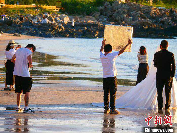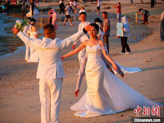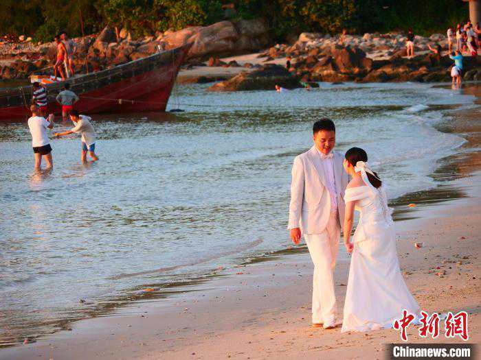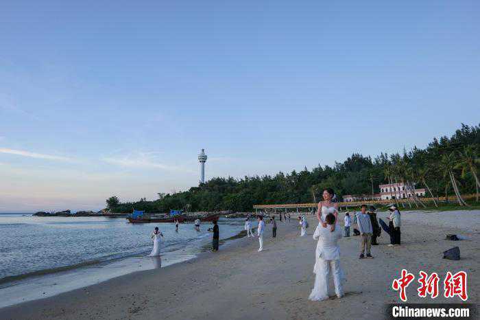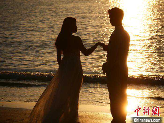 7月23日,新人在海南文昌木兰湾海边拍摄婚纱照。