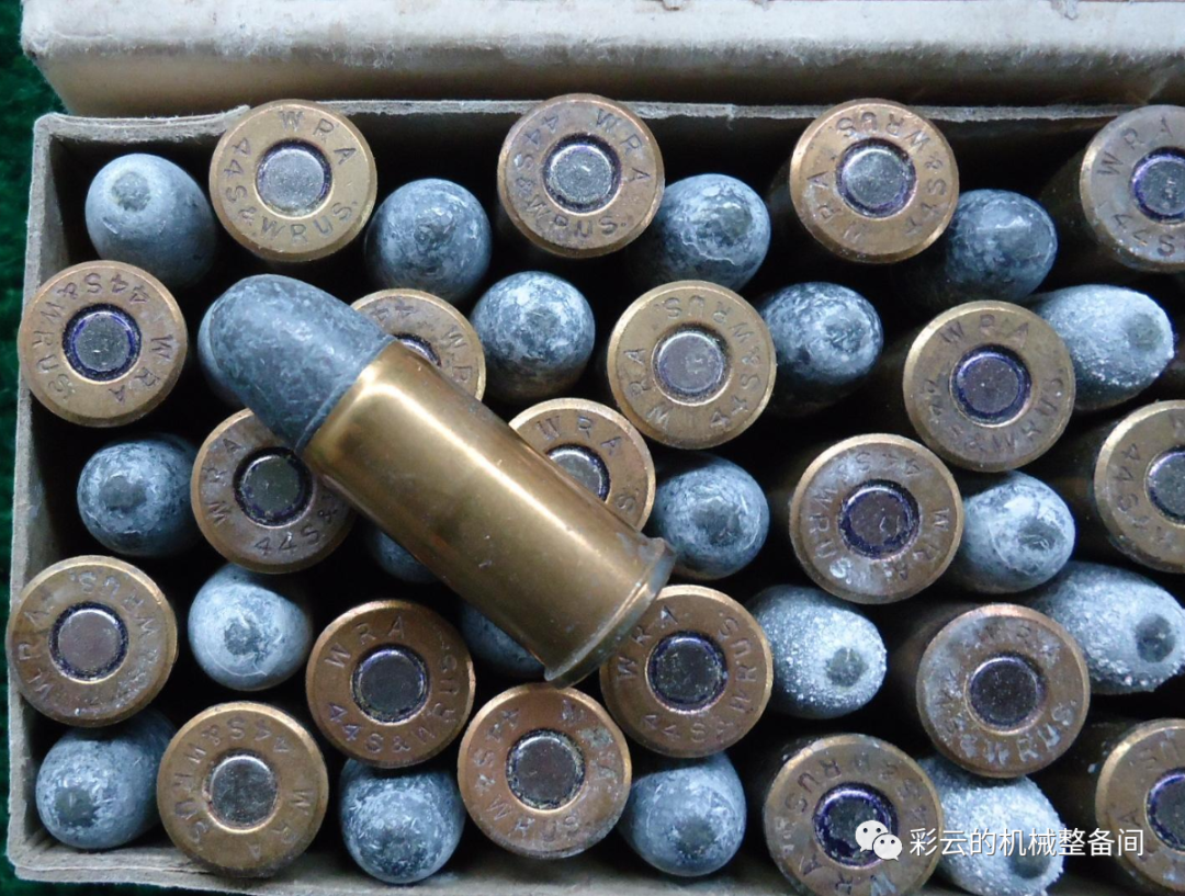 在美国,.44英寸转轮手枪弹最早的鼻祖是.44英寸史密斯-维森手枪弹(.44SW,或者叫.44SWAmerican),这是一种配用于史密斯-维森转轮手枪的大型黑火药转轮手枪弹,还在使用外润滑弹头(HeeledBullet),弹头外径与弹壳口外径一样粗,弹头外周有容纳润滑蜡脂的沟槽。