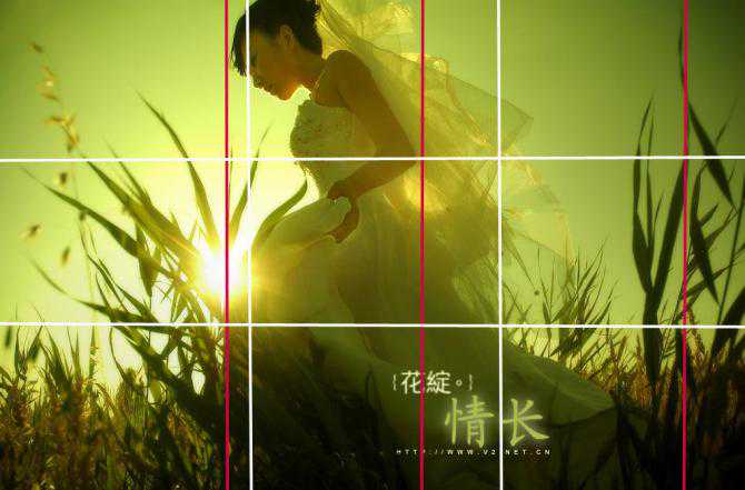 注意示例图,我进行了构图比例分析,白色是三等分线红色是人物取景框架线大家可以看看跟黄金比例构图的出入