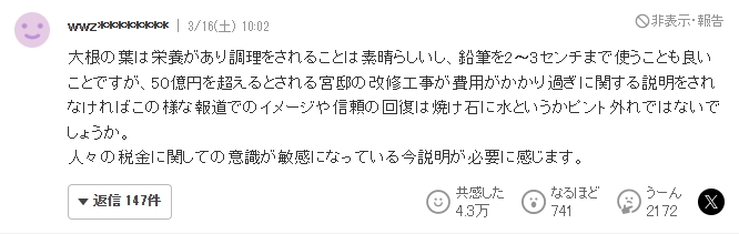 萝卜叶有营养,用来食用非常好。使用2至3厘米长的铅笔也是一件好事。但是,如果不解释50亿日元的宫邸翻修费,想单凭这种报道恢复形象和信任,就是杯水车薪,或是完全离谱。眼下人们对纳税敏感,因此需要解释。