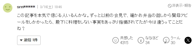 有人真的相信这篇报道吗?在很久以前的见面会上,确实是从便当的话题开始宣传贤妻良母形象的,但被殿下很干脆地指出不做饭的事实,现在不一样了?
