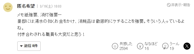 强制用纸、强制熄灯在豪宅上花钱如流水,耗材上却彻底抠门。那里的工作人员真惨!