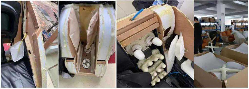 可以看到一些劣质按摩椅采用1D和2D塑料机芯,触感上生硬,缺乏导轨支持,导致按摩效果极差。此外还有一些木质结构的框架不够稳固,容易出现摇晃。外层的塑料覆盖和低质量的皮革内衬根本不耐用,容易磨损,异味。此外,还有一些内部的电线和导气管如果没有妥善隐藏或保护,十分不安全。