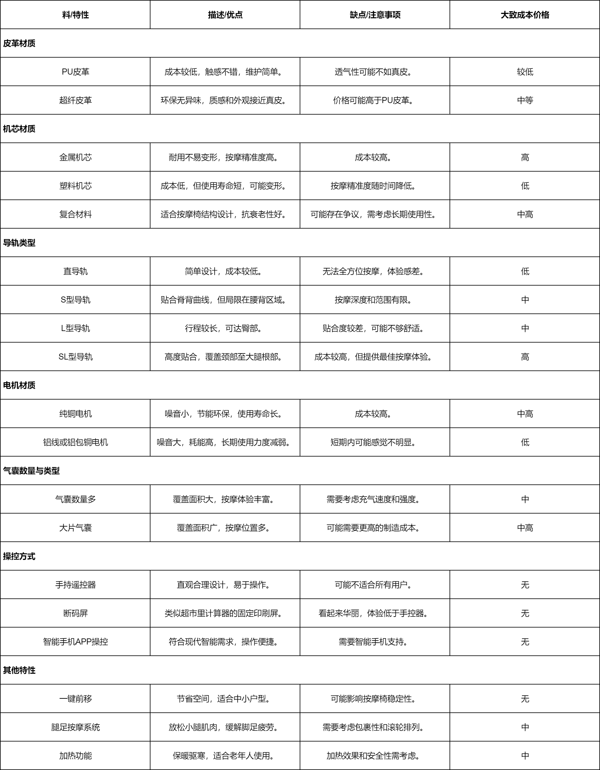 其次就是材料,一台按摩椅体积较大,使用的材料很多,从机芯到导轨到气囊到内衬,样样都要优质,如果是贴牌杂牌的是样样都是选择最低成本,使用体验到最后也就是天壤之别,相信把下面这个图看下来就可以看到各种材料的大致差别。
