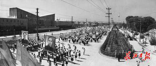 1953年国庆节,庆祝游行的队伍经过汉口解放大道。记者摄