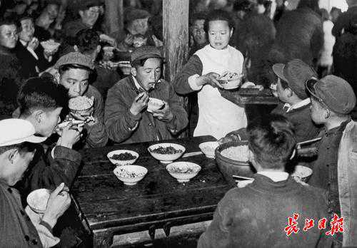 1958年,人民公社食堂吃饭不要钱。这是湖北省应城县红旗公社的社员们在食堂吃“大锅饭”。记者梅村摄